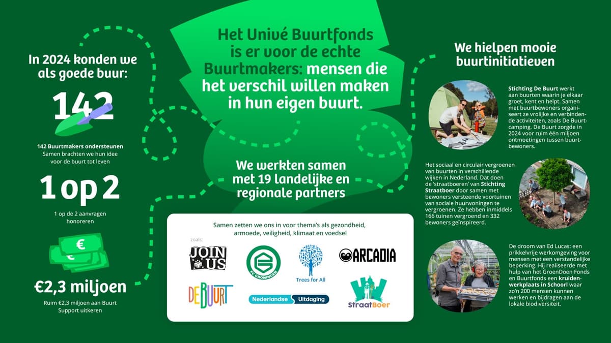 Van een groen ontmoetingsplein tot voedselbos en van een speeltuin die voor iedereen toegankelijk is tot een mooie sportieve activiteit voor de buurt: het Univé Buurtfonds ondersteunt kleinschalige buurtprojecten met blijvend effect. Dat deden we in 2024 via onze samenwerkingen met 19 verschillende partners en door initiatieven van particuliere Buurtmakers te ondersteunen.