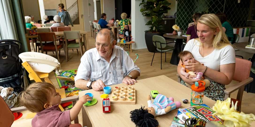 Drie generaties verbinden met goede koffie, speelmateriaal en activiteiten: dat is Boefjes en Barista’s. De wekelijkse activiteiten in woonzorgcentra brengen jonge kinderen, hun ouders en senioren samen. Haar eigen ervaring als jonge moeder bracht initiatiefnemer Carlijn van den Berge op het idee.